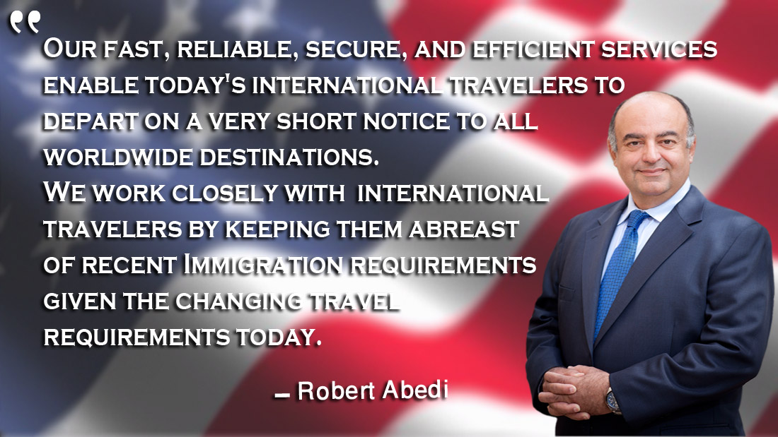 Our fast, reliable, secure, and efficient services enable today’s international travelers to depart on a very short notice to all worldwide destinations. We work closely with international travelers by keeping them abreast of recent Immigration requirements given the changing travel requirements today.